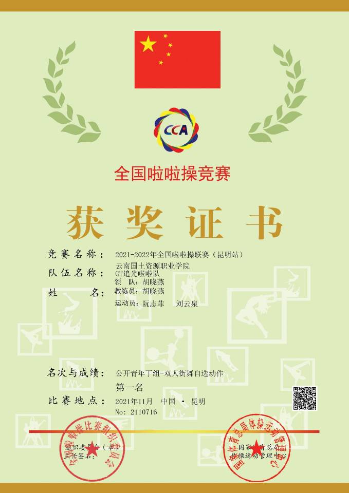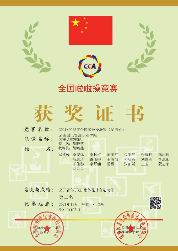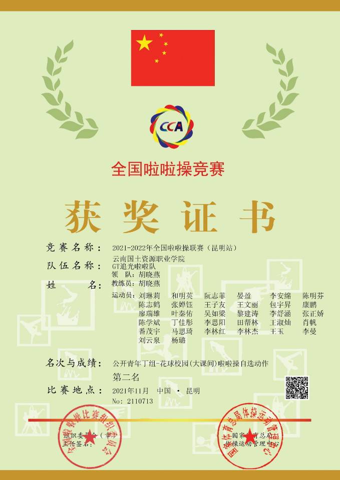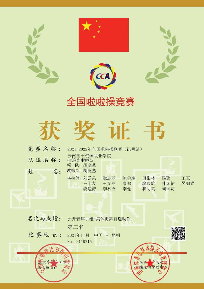 本年度获得两金三银的好成绩,获得荣誉具体为: 2021—2022年全国啦啦联赛(昆明站)公开青年组双人街舞自编动作,荣获省级第一名;自编广场舞,荣获高职高专组省级第一名;公开青年组集体街舞,荣获省级第二名;公开青年组花球校园啦啦操,荣获省级第二名;公开青年组集体花球啦啦操,荣获省级第二名;