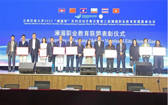 在澜湄职业教育联盟年度表彰仪式上,16家联盟单位分别获得特别贡献奖、服务卓越奖、优秀案例奖和人文交流奖。大会还正式发布了首届澜沧江—湄公河原产地产品创意设计大赛和澜沧江—湄公河流域国家青年旅游线路设计大赛赛程。