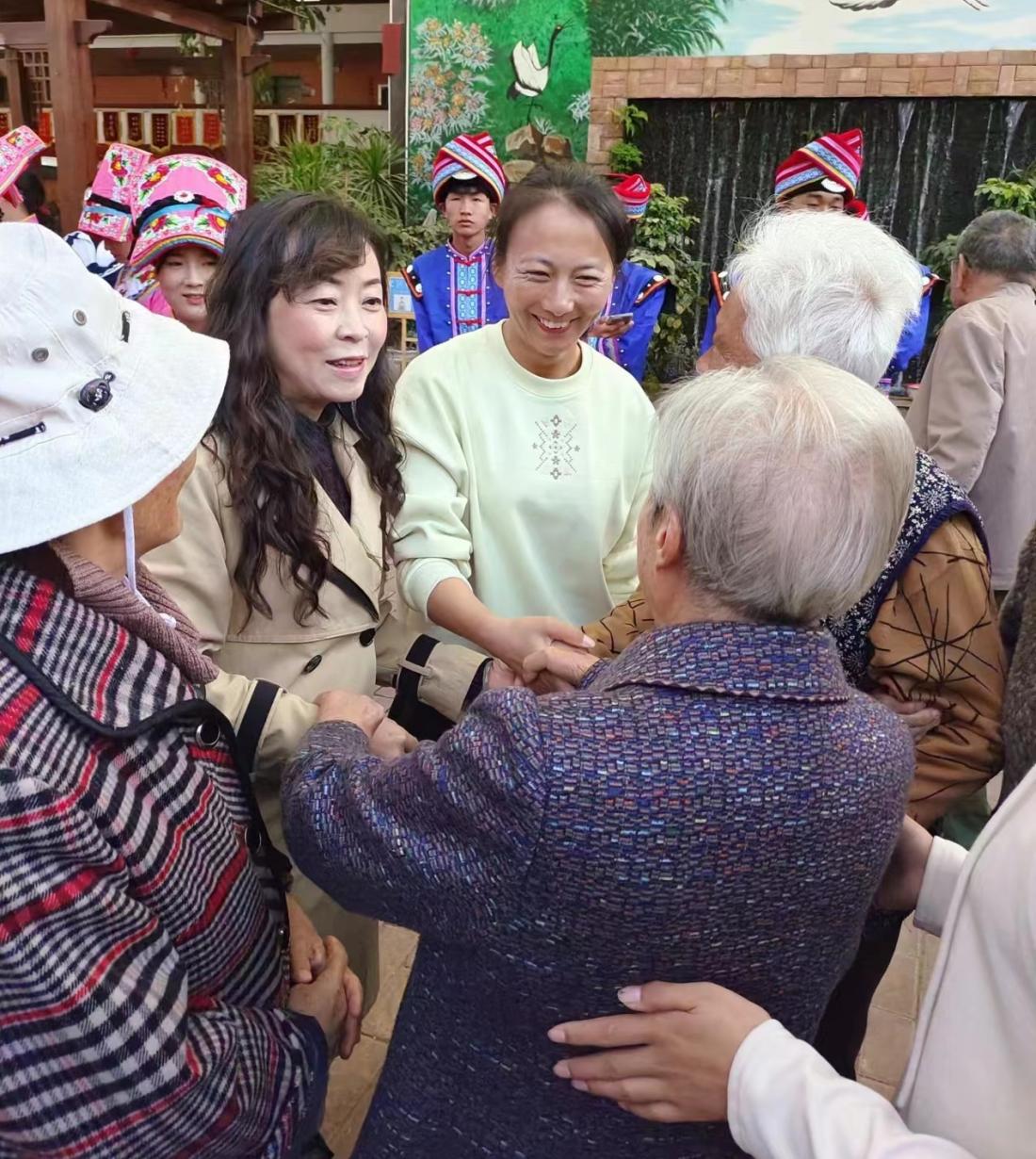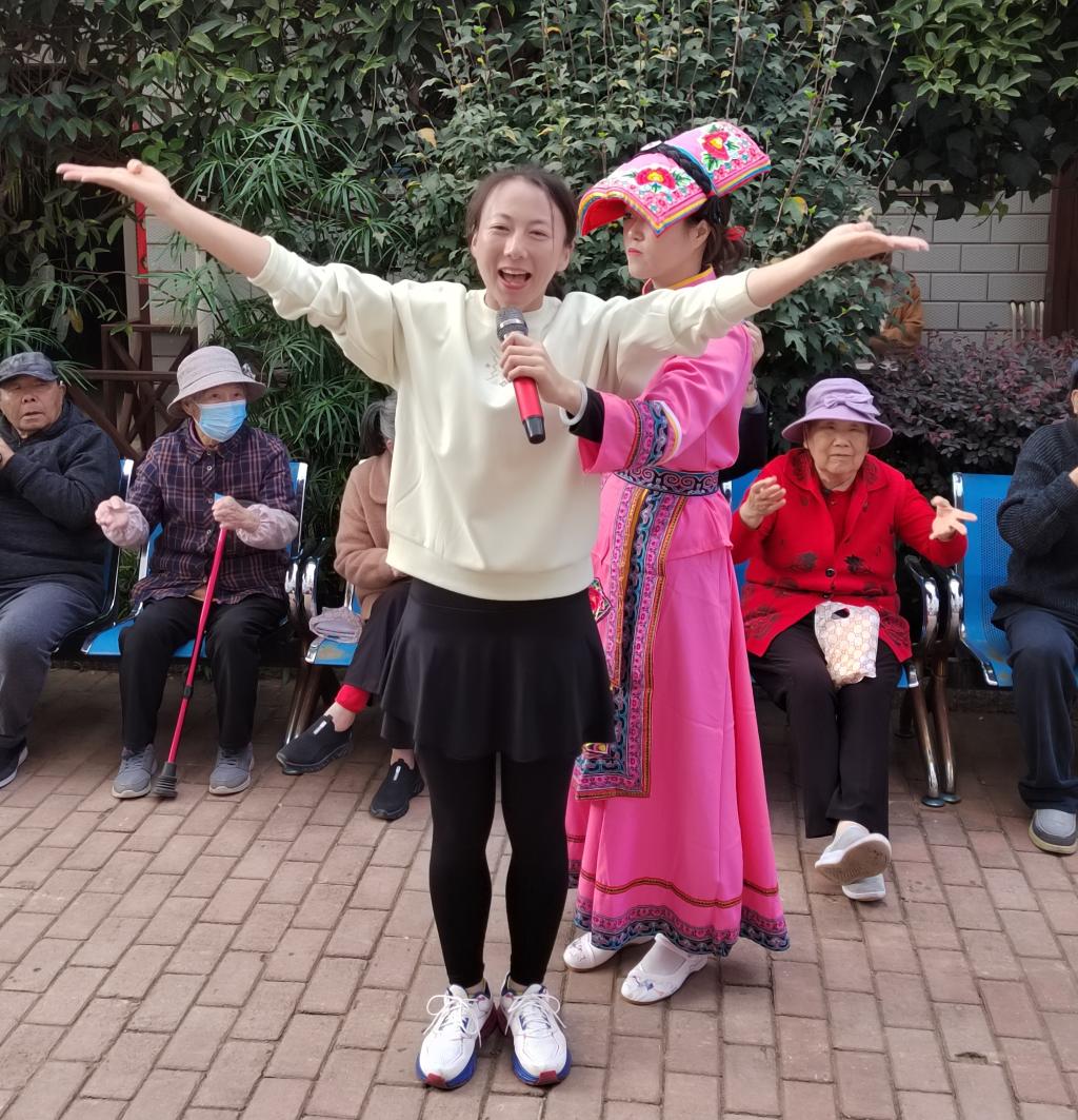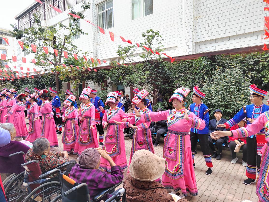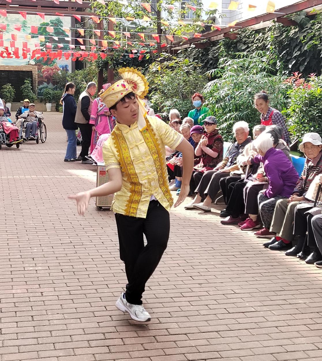 10月22日上午,60余名师生来到昆明“当你老了”健康养老中心,陪伴老人们度过了愉快的重阳节。在表演环节,同学们为老人们表演了精彩的啦啦操、羌族舞蹈、傣族舞蹈等节目,护工们也表演了彝族舞蹈,赢得了老人们的阵阵掌声。在赠送礼物环节,老师们为老人们送上了暖心的小礼物和真挚的祝福。在互动环节,胡晓燕老师带领老人们一起做手指操,老人们认真学习,互相纠正动作要领。在畅聊人生环节,师生们与老人们进一步交流,倾听他们的心声,向他们学习人生智慧。最后大家一起合唱歌曲《当你老了》,献给老人们逝去的但永远未褪色的青春。临别时,老人们紧紧握住师生们的手,感谢他们带来的温暖与陪伴,与他们依依惜别。