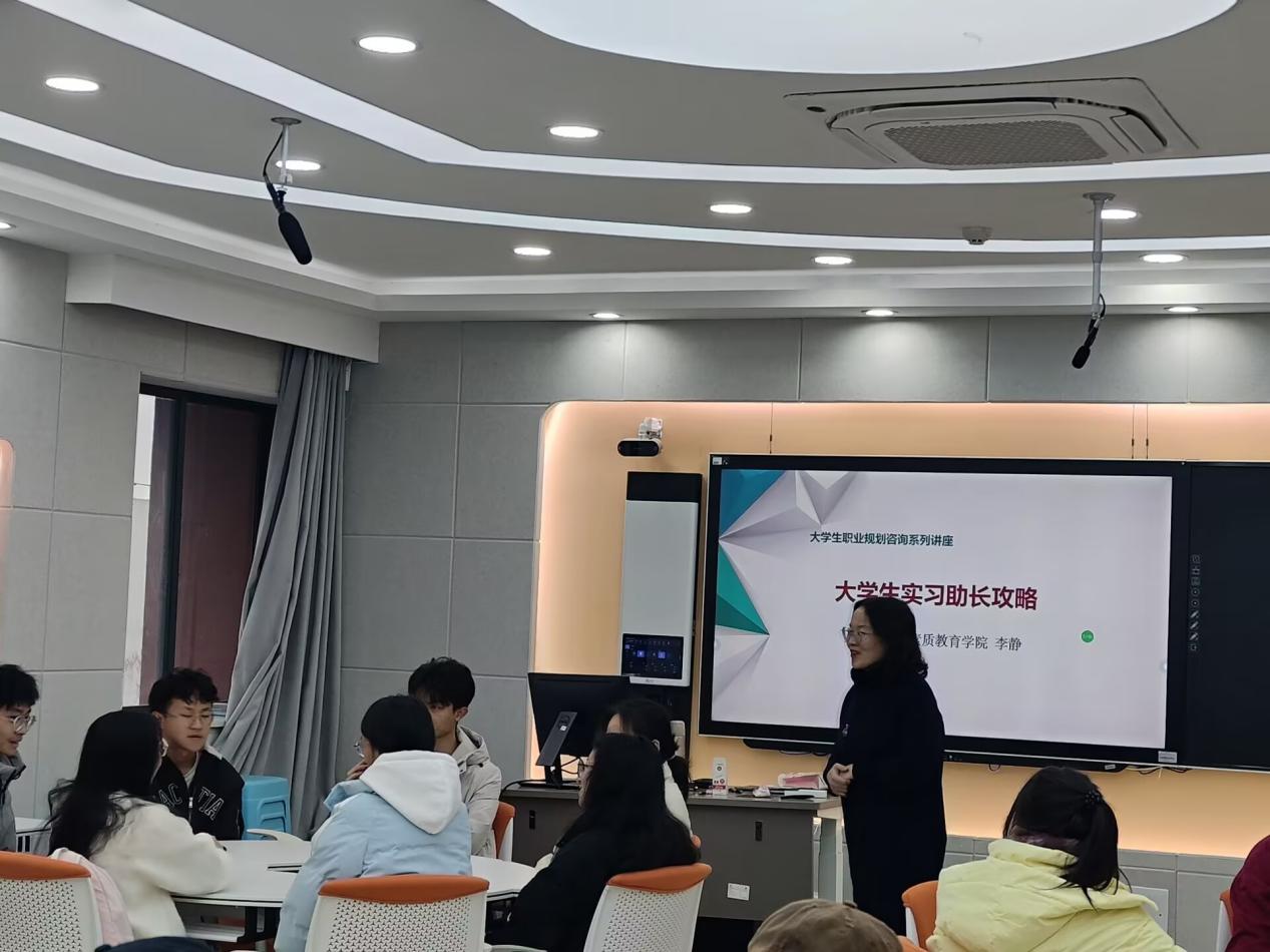11月27日下午,太阳成城集团tyc234cc官网李静老师在阳宗海校区崇实楼505教室开展了题为“老员工实习助长攻略”的职业规划咨询讲座。