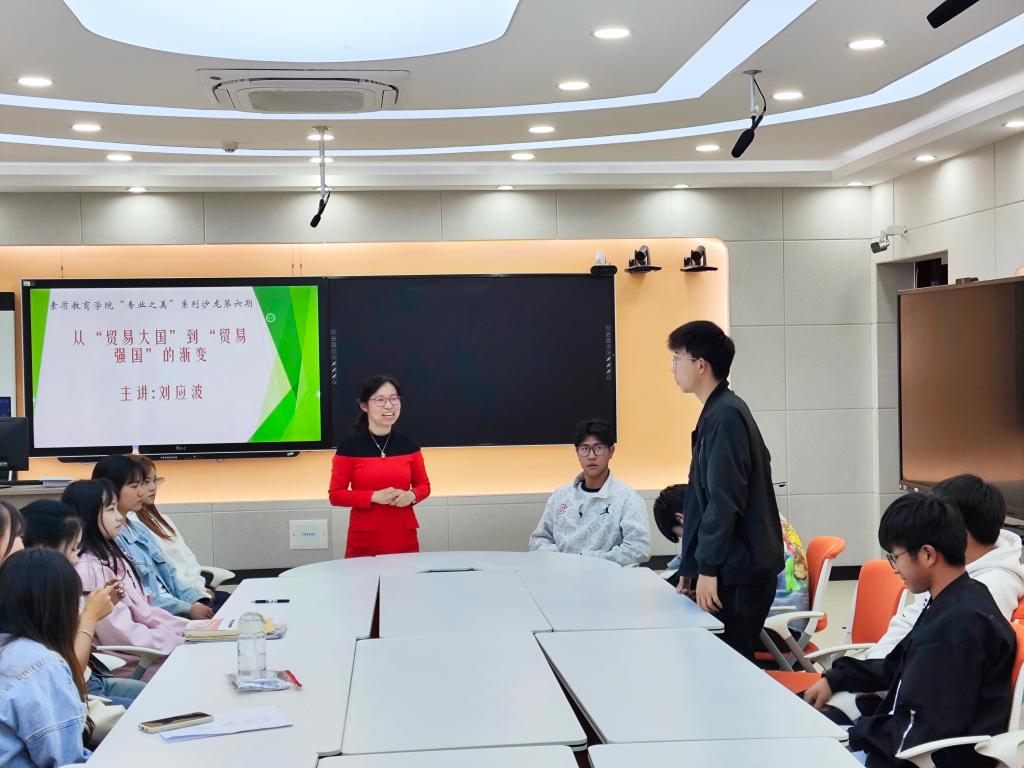 3月28日,太阳成城集团tyc234cc官网“专业之美”沙龙第六期在崇实楼505智慧教室举办,公司教务处副处长刘应波以《从“贸易大国”到“贸易强国”的渐变》为题与同学们共同探讨“专业之美”。沙龙由太阳成城集团tyc234cc官网经理陈南苏主持,素质教育公司党总支书记苏和平到场聆听。