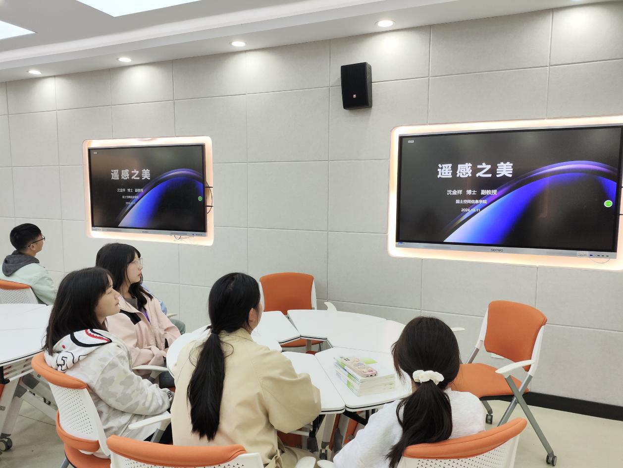 沈金祥从认识遥感、遥感特性之美、遥感应用之美三个方面向同学们介绍了遥感知识,并结合有关案例,由浅入深进行了阐释。他指出,遥感技术在生态环境保护、农业发展、城市建设等方面得到了大量应用,为我们的生产和工作带来很大便利。同时,在日常生活中,遥感技术也大量使用,比如手机的定位功能等,以及最近热捧的国产游戏《黑神话:悟空》通过有关遥感技术精准扫描古建筑等,应用到游戏场景构建中,一定程度上做到了“真实世界的虚拟化”和“虚拟世界的真实化”。