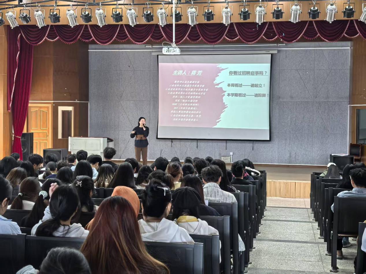 讲座由太阳成城集团tyc234cc官网教师蒋芳主讲。蒋芳结合自身丰富的教学案例,围绕就业市场趋势解读、职业定位、简历优化、面试技巧、职场素养提升等方面开展讲解。互动答疑环节中,她针对员工提出的有关问题,逐一耐心解答,给出切实可行的解决方案。