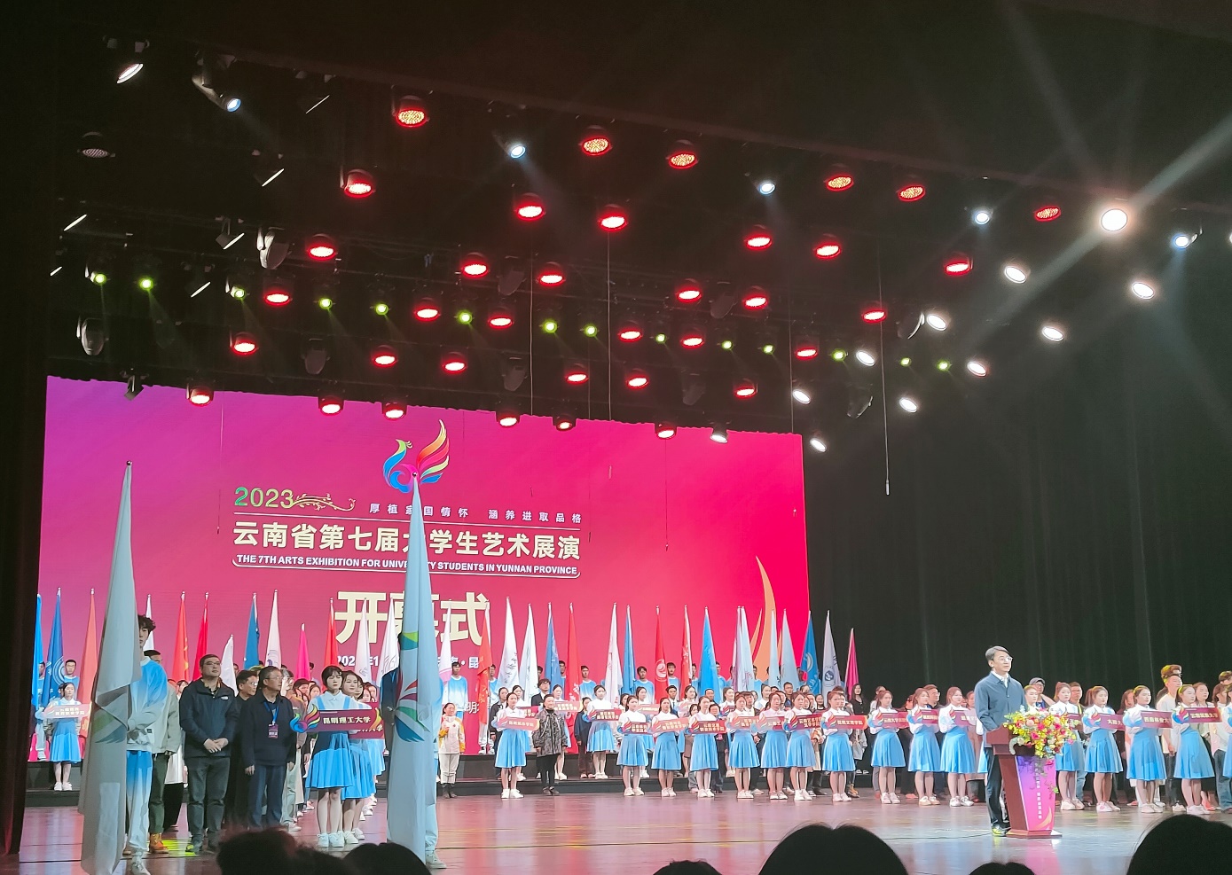 首先由一首合唱《红旗颂》拉开了开幕式的序幕,随后一一介绍了云南81所高校美育工作开展的情况,云南省教育厅厅长王云霏在开幕式上致开幕词。