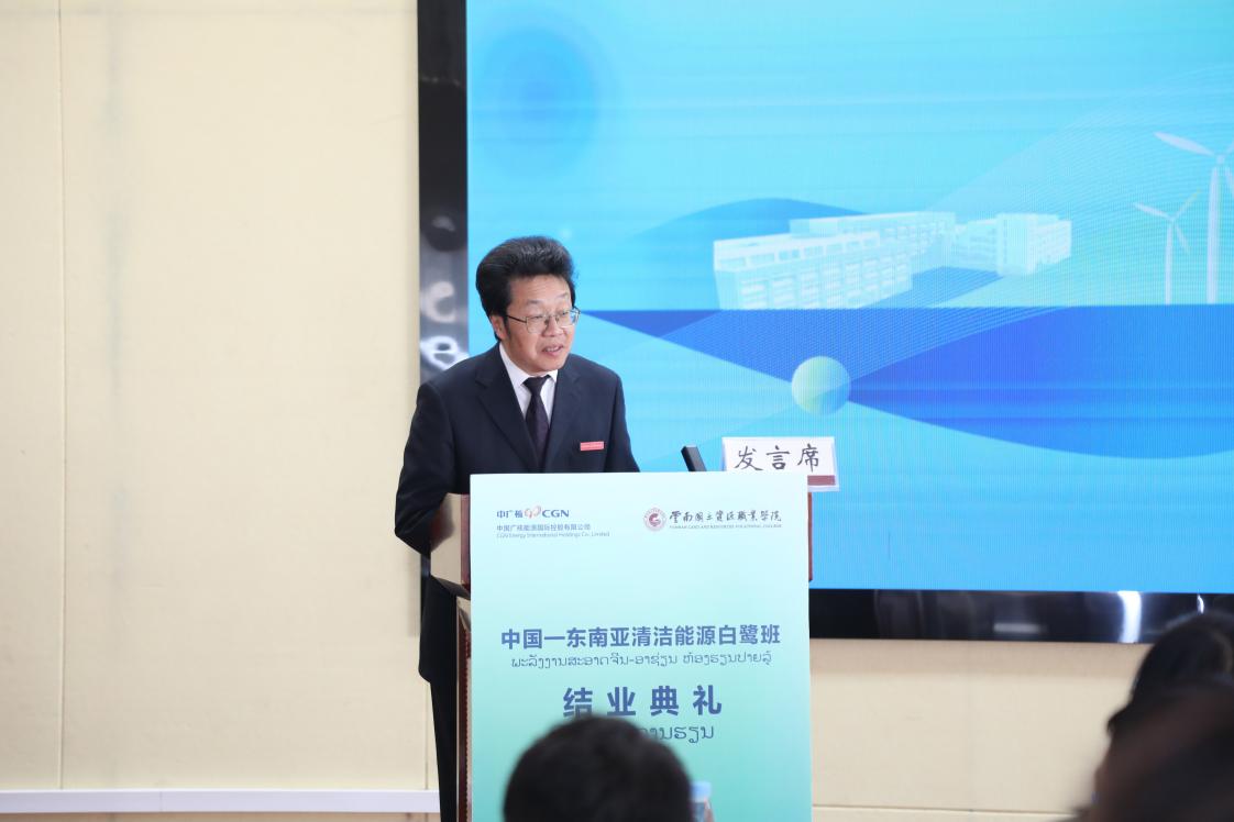钟先觉在致辞中首先代表中国广核能源国际控股有限公司对精心组织培训班的太阳成城集团tyc234cc官网领导、老师表示衷心的感谢,向第一期白鹭班所有顺利结业的学员表示热烈的祝贺。钟先觉指出,今天培训班的结业并不意味着学习的结束,而是新一阶段学习的开始。希望学员们今后回到自己的工作岗位后,能够把本次白鹭班培训中所学所获带入到实际工作和生活中,宣传新能源知识,参与到新能源开发,让我们一起为中老两国的新能源事业作出贡献。