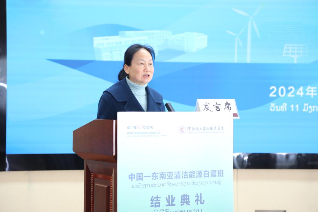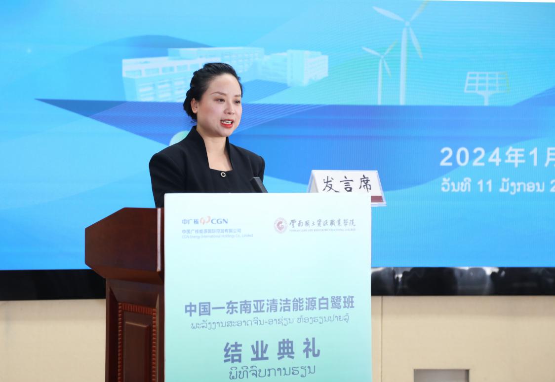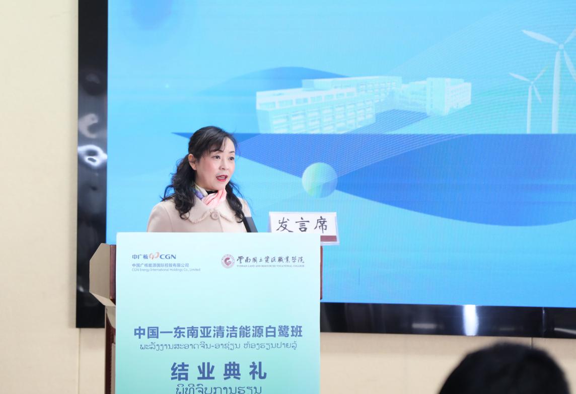 陈颖在致辞中代表公司对本次培训班的顺利完成表示祝贺,祝贺所有培训学员经过这段时间的努力,顺利完成了培训课程和通过考核,按期结业。陈颖表示,此次与中国广核能源国际控股有限公司合作共同承办的中国-东南亚清洁能源白鹭班,是推进“教随产出、产教同行”的具体实践。下一步,我们有信心与中国广核能源国际控股有限公司紧密围绕新能源领域开展更加深度和广泛的校企合作,培养中资企业亟需的国际化技能人才,为“留学中国•学在云南”贡献国土力量。