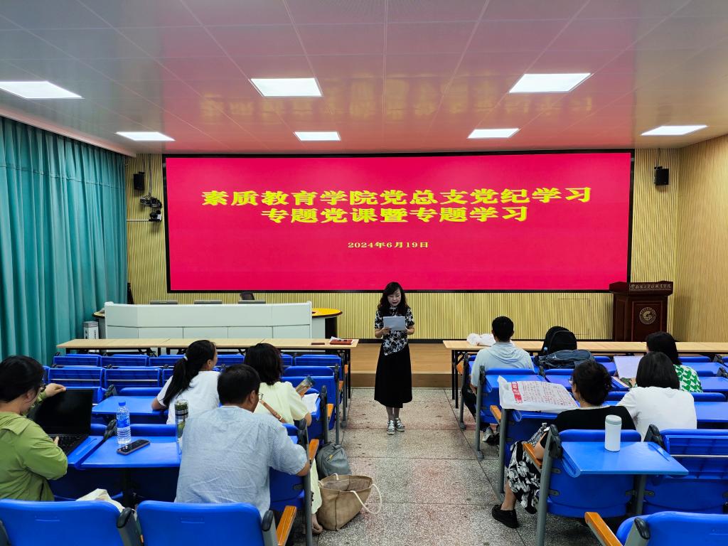 6月19日,素质教育公司党总支在经开区校区教学楼110开展党纪学习教育专题党课暨专题学习。